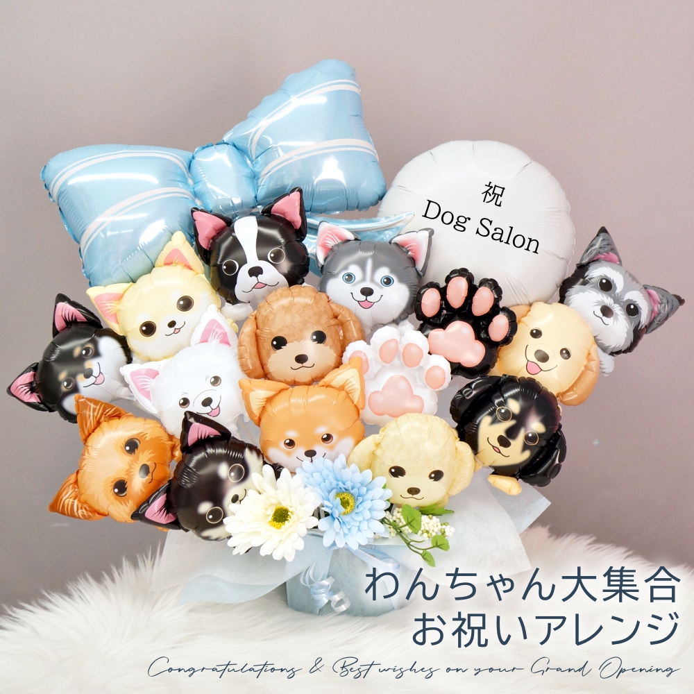 わんわん大集合バルーンアレンジ電報の紹介・置き型で飾りやすいバルーンギフト・飾るだけで一気にその場が華やかに!・特別な熱加工を施したバルーンを使用しているので、約1か月以上〜長期間飾って楽しんでいただけます。・造花を使用しているので生花がダメな場所でも気にせず飾っていただけます。サイズ約50×60cmタイプ置き型アレンジ机などに飾っていただけますお楽しみ期間アレンジメント 約1ヶ月〜半年程度※飾る環境などにより異なる用途動物病院、ドッグカフェ、猫カフェ、トリミングサロン、開店祝い、開院祝い、移転オープン、リニューアルオープン、バルーン電報、お祝い、飾り付けなどにメッセージカード嬉しい無料印字サービス!(ご希望の方のみ)カードサイズはL版サイズ注意点※当日出荷不可全てのバルーンはご注文後に制作、検品後に発送しております。大切な日に確実にお届けできるよう余裕をもってのご注文をお願い致します。デザインの変更承ります。お気軽に備考欄にお書きください。気圧の関係上、北海道、沖縄、へのお届け不可 |