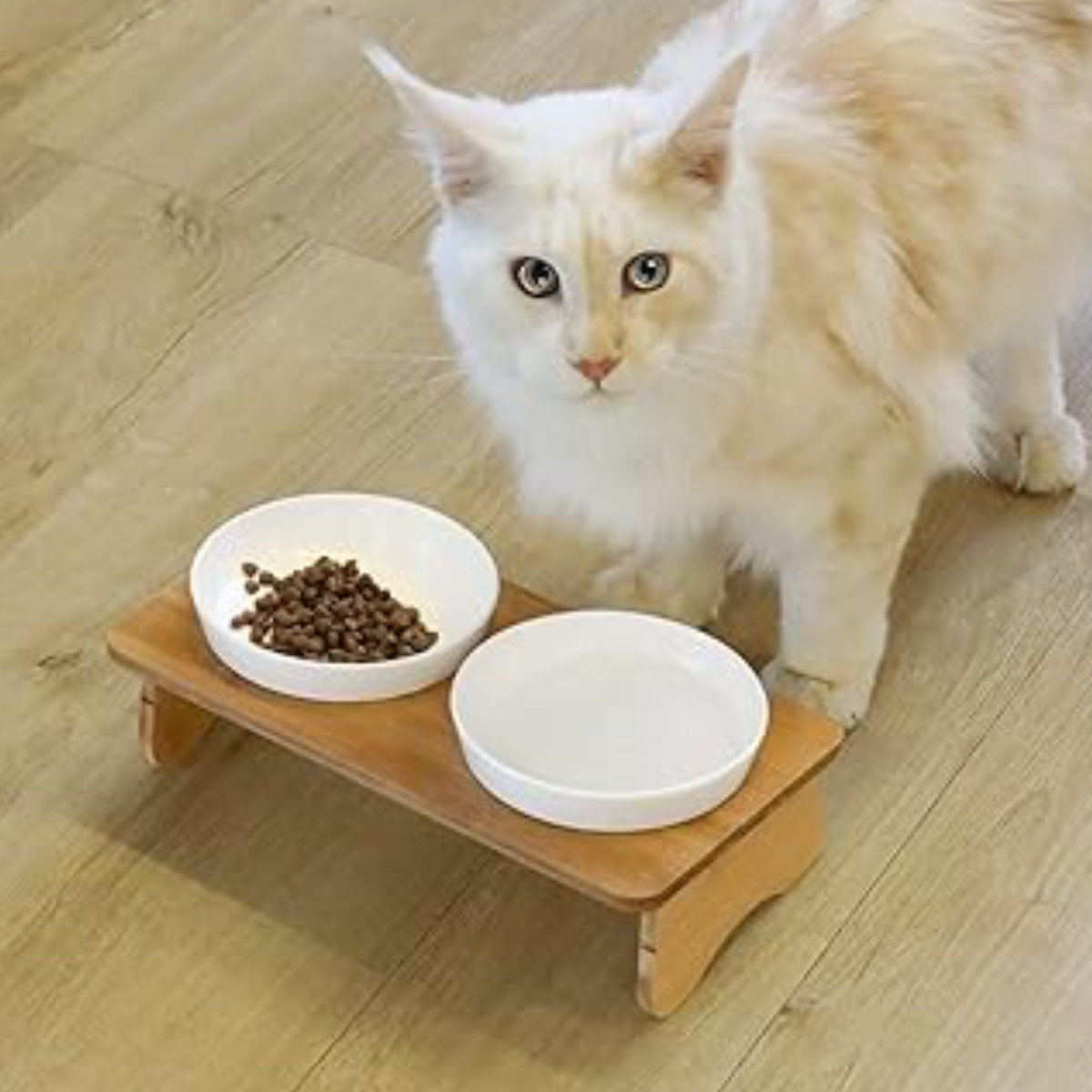 猫 食器 猫用 餌入れ ねこ 水飲み 水 皿 えさ 入れ 水入れ ボウル 子猫 食器台 陶器 可愛い スタンド セット 食べやすい、飲みやすい 猫ちゃんが楽な姿勢で食べられるちょうどよい高さです。適度な深さで鼻先が器にあたりにくくお水も飲みやすいです。 体に負担がかからない 首を曲げすぎない高さで、猫ちゃんの餌の吐き戻しを軽減する設計です。首や腰などの負担も考慮した傾斜となっています。 安心安全 原料にこだわった高品質なセラミックを使用しています。表面のコーティング加工により傷が付きにくく、雑菌繁殖を抑え清潔で快適な食事が楽しめます。 おしゃれなデザインと高い安定性 お部屋に合わせやすいデザインと、しっかりとした重量のある器で、ネコちゃんが食べている中も安定感があります。 ご飯もお水もコレでOK ドライフードとウェットフード、お水とフードなど分けて使えてネコちゃんも大満足です♪素材スタンド:天然木(竹) |